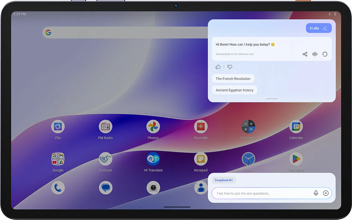 Устройство работает под управлением Android и предлагает дополнительные функции: голосовой ассистент Ella, AI-алгоритмы оптимизации и возможность расширения памяти с помощью карты microSD. Планшет подходит как для работы, так и для мультимедиа и обучения.