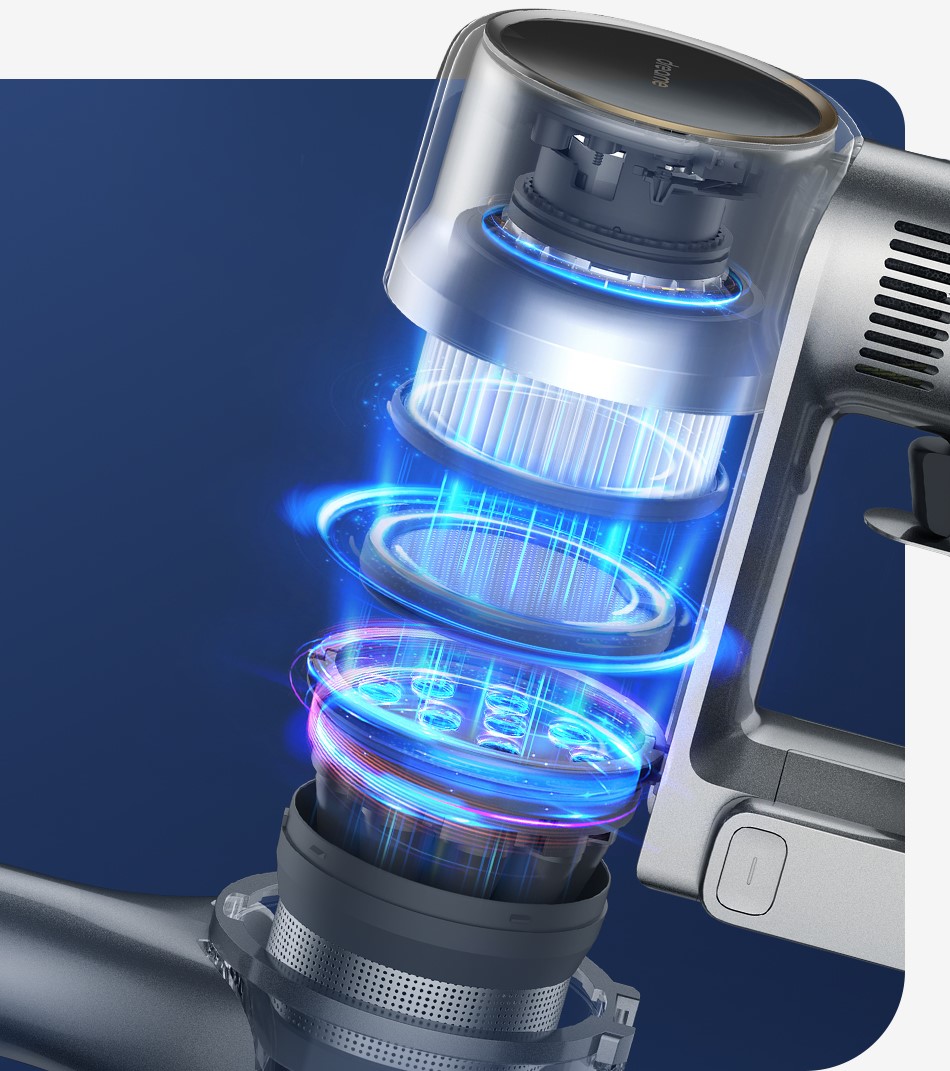 Усовершенствованная многоуровневая система фильтрации Dreame R20 улавливает пыль и частицы с эффективностью 99,9%. Пыль надежно запирается внутри контейнера.