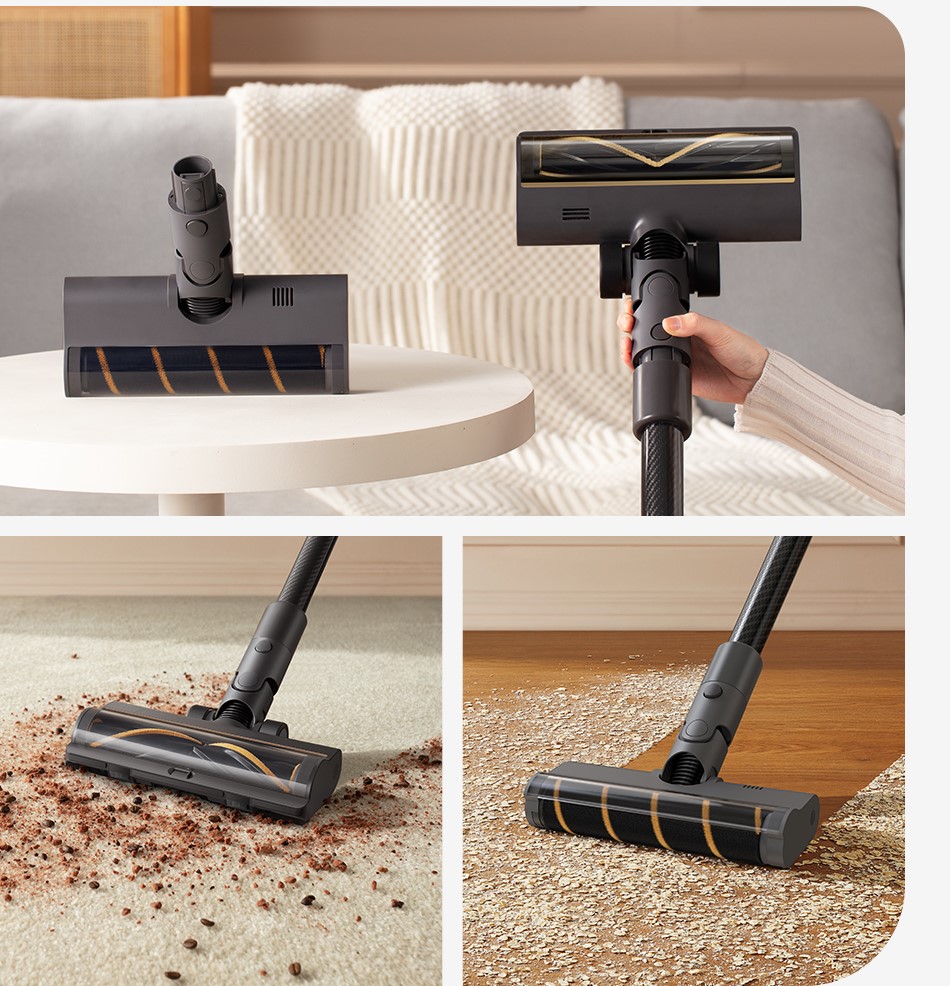 Многофункциональная роликовая щетка с V-образной щетиной эффективно удаляет пыль и грязь на различных поверхностях, благодаря инновационной конструкции всасывающего отверстия. Щетка V-образной конструкции Dreame R20 почти не наматывает волос.