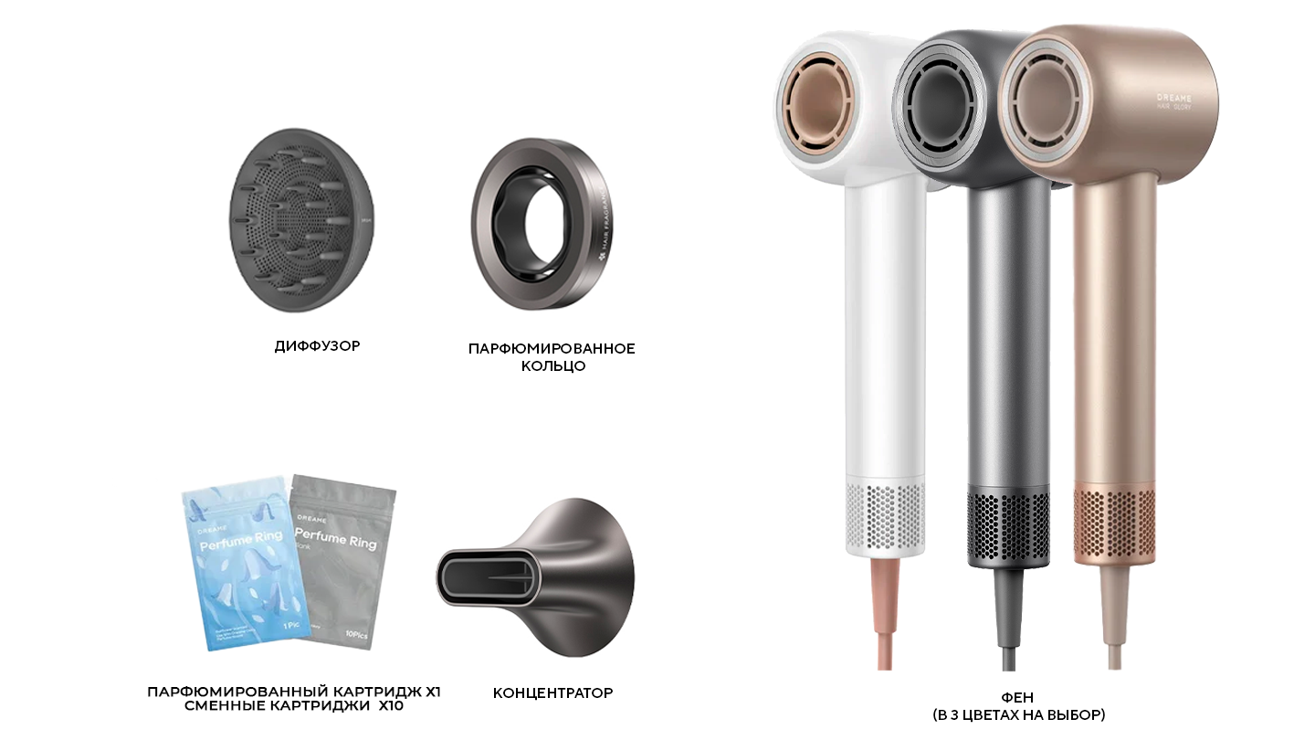 В комплект входят насадка-концентратор для направленного потока воздуха и насадка-диффузор для создания объёма и естественной текстуры. Также в наборе предусмотрена документация. Dreame Hair Glory Mix подойдёт тем, кто ищет лёгкий, функциональный и тихий фен для ежедневного ухода за волосами.