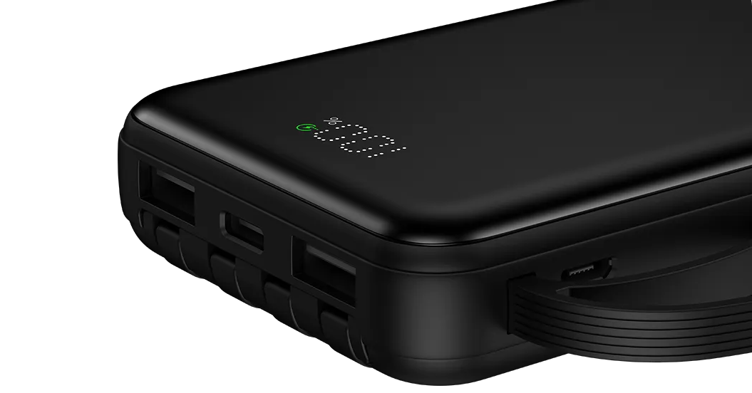 Модель выделяется наличием четырёх встроенных кабелей, что делает использование особенно удобным. На корпусе уже предусмотрены кабели USB-A, microUSB, Lightning и Type-C. Это полностью устраняет необходимость носить с собой дополнительные провода и позволяет заряжать практически любое устройство — от Android-смартфонов и гарнитур до аксессуаров Apple.