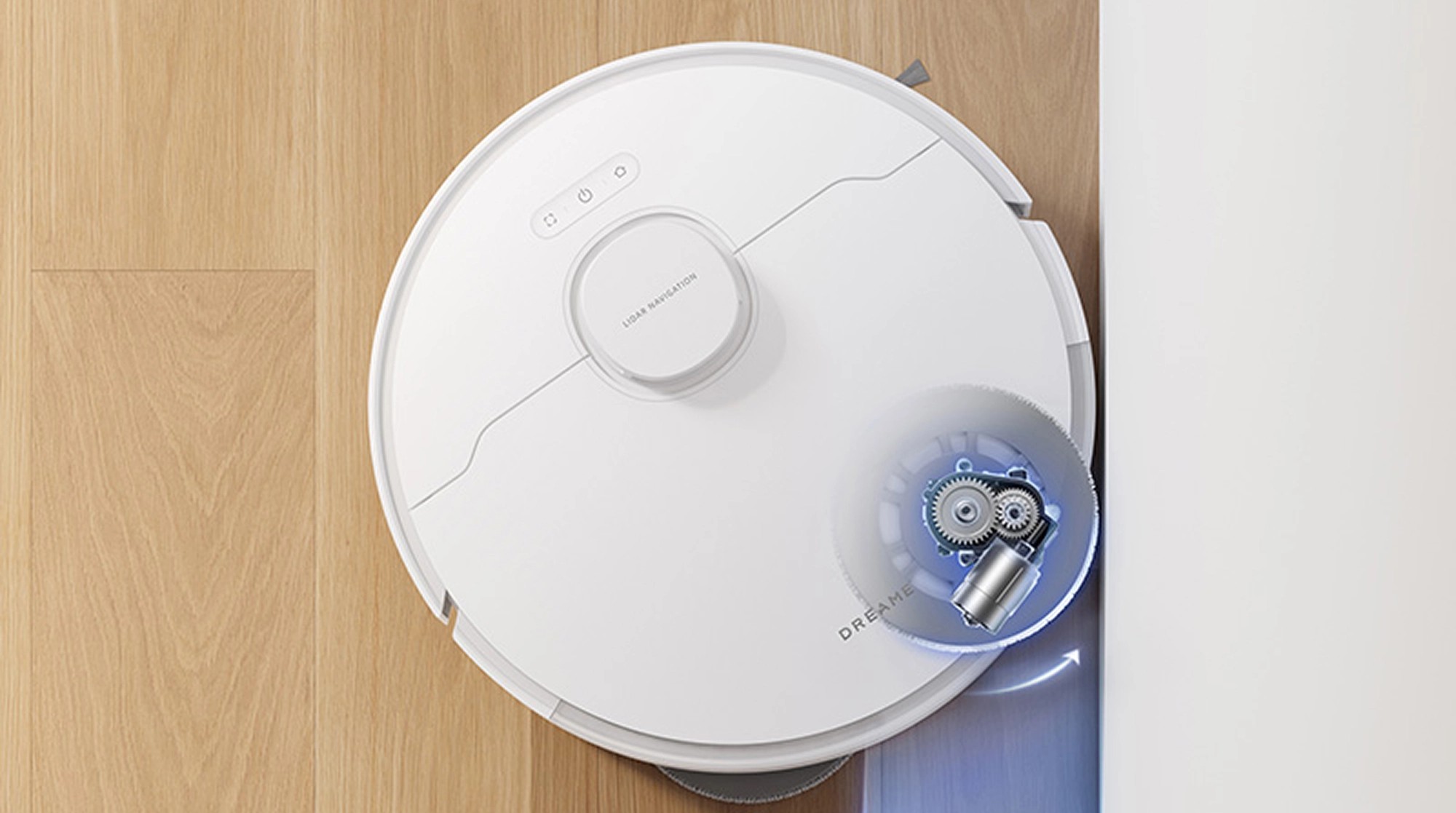 Робот-пылесос Dreame L40 выполнен в белом цвете с серыми акцентами и имеет современный минималистичный дизайн. Компактные размеры — всего 9,7 см в высоту — позволяют устройству легко проходить под мебелью. Продуманная конструкция с боковой щёткой помогает тщательно собирать пыль и мусор даже вдоль стен и в углах.