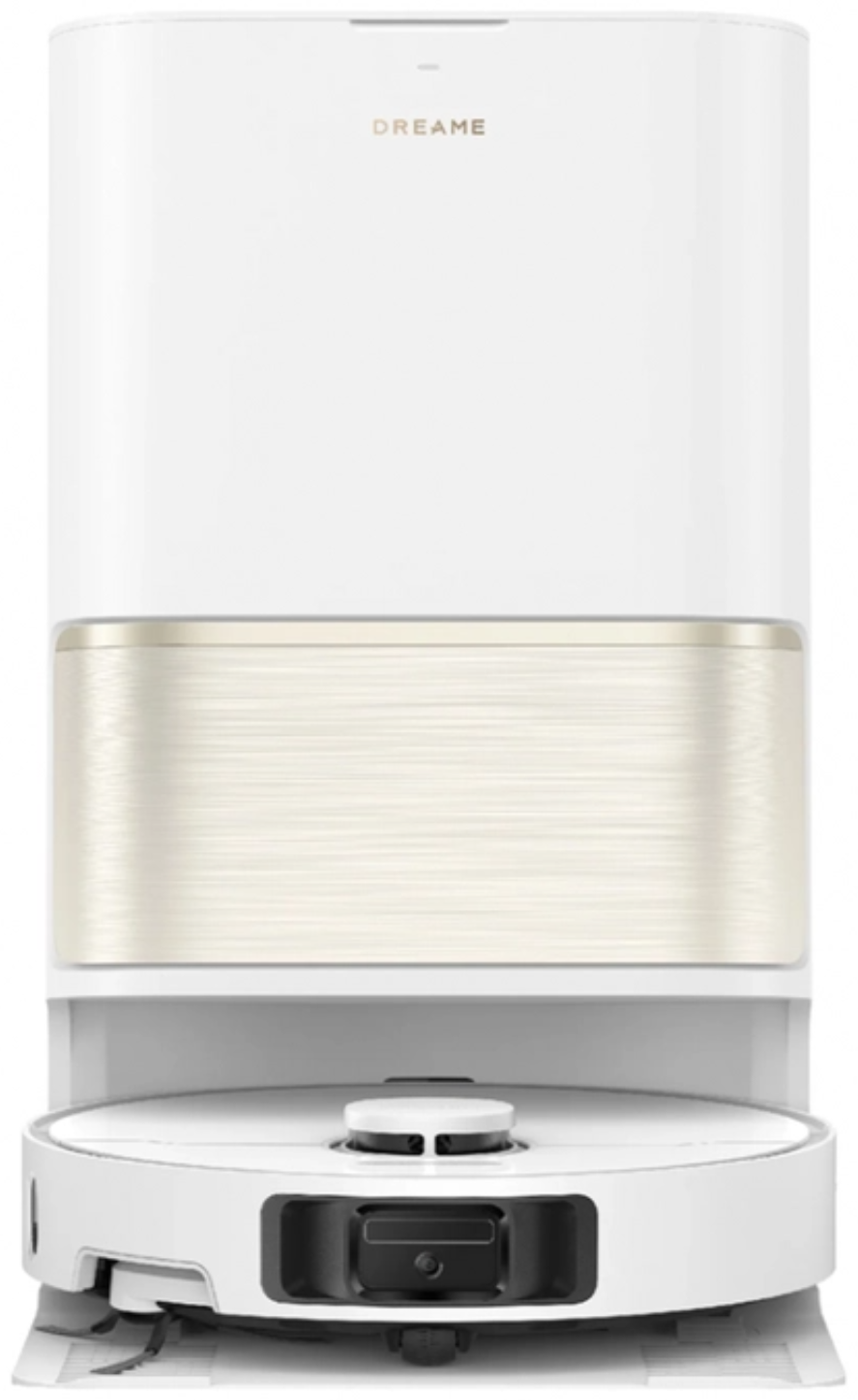 Dreame L50 Ultra CE сочетает мощную сухую и влажную уборку с интеллектуальной навигацией. Белый корпус с золотистыми акцентами подчеркивает премиальный стиль устройства.